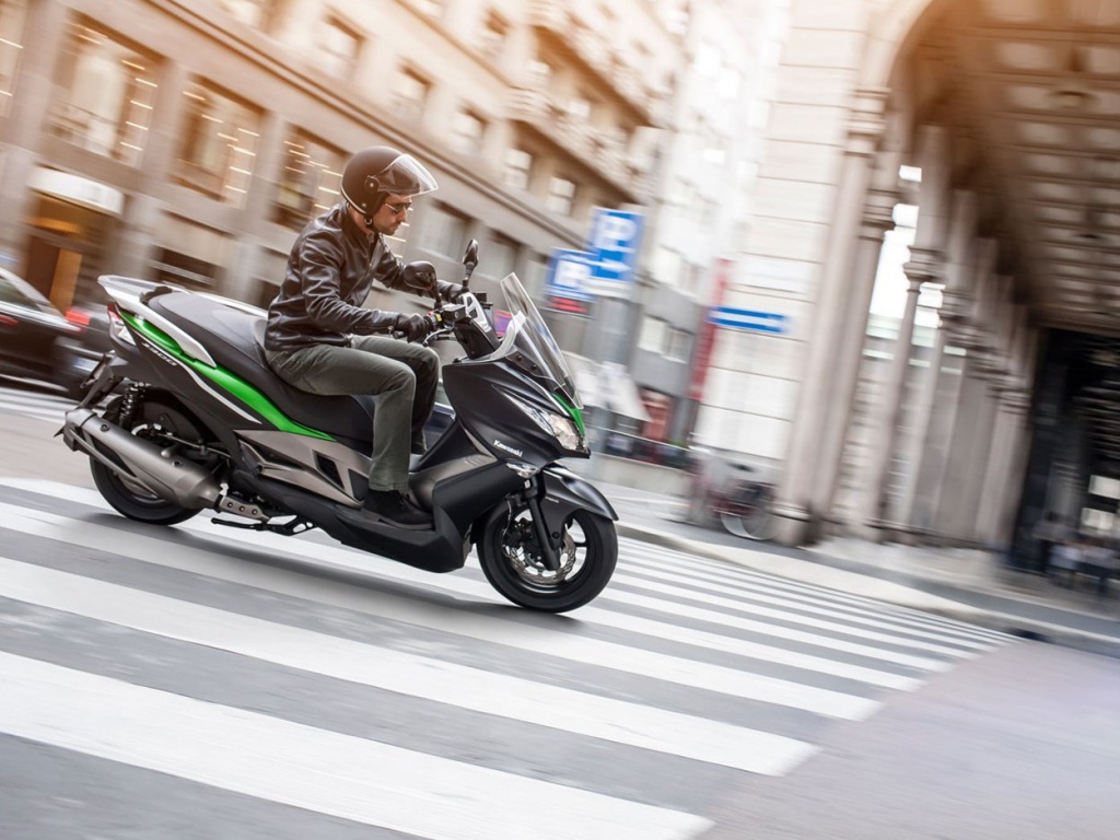 Kawasaki J300 — одна из самых ожидаемых премьер мотовыставки EICMA 2013, которая открылась вчера в Милане. Дело в том, что японский производитель впервые разработал достойный скутер специально для европейских покупателей. Конечно, не стоит забывать, что скутер Kawasaki J300 разрабатывался в тесном сорудничестве с тайваньским изготовителем Kymco, который поставляет двигатели для скутера: 299 см3, жидкостное охлаждение, 1-цилиндровый, мощность 29.5 л.с. и крутящий момент 25 Нм. Таким же силовым агрегатом комплектуются скутеры Kymco Downtown 300i. Несмотря на некоторые общие черты с Kymco, скутер J300 обладает характером Kawasaki, который прослеживается в дизайне и комплектации: агрессивный обтекатель, дизайн передних фар в стиле Kawasaki Ninja, светодиодные поворотники, задние фонари и т.п. Скутер оснащается 37-мм телескопической вилкой и регулируемыми (преднатяг) задними амортизаторами с 5 опциями настройки. По словам Kawasaki подвеска настроена для спортивного и агрессивного стиля езды, а место для ног спроектировано так, чтобы скутер J300 можно было закладывать немного больше, чем позволяют традиционные скутеры других производителей.